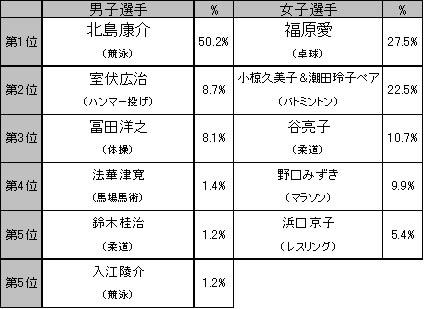 同アンケートで男子のトップに選ばれた「北島康介」さんは得票率50%を超える圧倒的な人気。女子のトップに選ばれた「福原愛」さんは、北京五輪での最年少旗手に選ばれており、ともに活躍が期待される中での"さわやか"なランクインとなりました。男子選手のランキングは、「北島康介」さんがトップ。また、先日主将に選ばれた柔道男子100キロ級代表の「鈴木桂治」さんもランクインするなど、五輪でのメダル獲得実績のある選手が名を連ねる結果となりました。「北島康介」さん、「室伏広治」さんはアテネ五輪での金メダルに続き連覇が期待されています。これまでの活躍に"さわやか"な印象を重ね合わせる女性が多いようです。