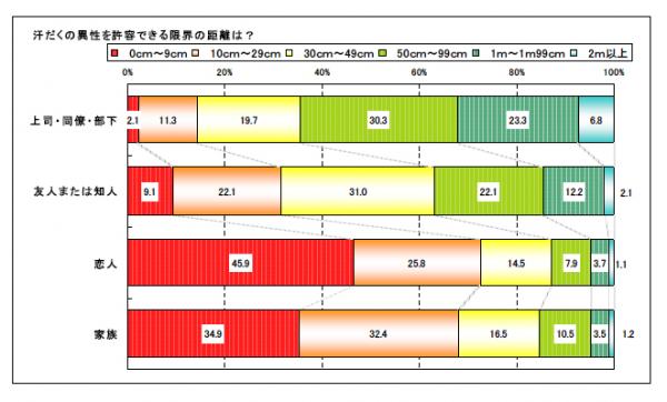 一方で、恋人や家族は「0cm~9cm」が(45.9%、34.9%)と最も高くなっていることから、汗をかいても近い距離まで受け入れられるという結果となりました。