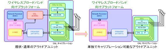 ワイヤレスブロードバンド向けマルチアンテナ基地局を用いると通信可能エリアの拡大、周波数利用効率の向上、通信速度の向上により、ワイヤレスブロードバンドネットワークを経済的に構築することが出来ます。しかし、これらを実現するには高機能なマルチアンテナ信号処理とアンテナ間の無線特性のばらつき校正処理(以下、キャリブレーション(注:1))の2つの処理を行う必要があります。このため、基地局を開発するには高度な技術が要求されます。