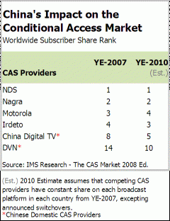 IMS Researchがこのほど発行した2008年のCAS市場に関する調査報告書「Conditional Access Market Shares - 2008 Edition」は、2010年末時点で、China Digital TVとMotorolaがそれぞれ世界のデジタルTV加入者の10%近くを獲得するとの見通しを示しています。尚、西欧のCASプロバイダーのうち、中国市場でリードを保っているのはIrdetoであり、NDSは後塵を拝する形になっています。