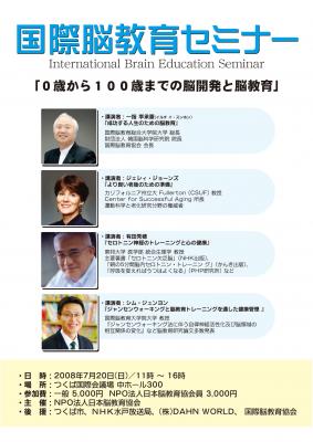 NPO法人日本脳教育協会は、知識の伝えることを主とした教育ではなく、脳自体が自覚できる体験的な教育方法である脳教育を研究し、普及をしています。2008年、日本で始めて行なわれる「国際脳教育セミナー」は、人類の脳に関する認識を高め、これからの未来をより健康・幸せ・平和に過ごすための提案や講演を行ないます。今回開かれるこの国際脳教育セミナーは、国内外から、脳に関心の高い方々をお招きし、講演を開催いたします。カリフォルニア州立大 Fullerton (CSUF)教授で運動科学と老化研究分野の権威者である、ジェシー・ジョーンズ博士、日本でセロトニン神経の研究をされている有田秀穂教授、若返るウォーキング法として、韓国でブームとなった誰でも簡単に行なえる健康法から『ジャンセンウォーキングと脳教育トレーニングを通した健康管理』の研究されているシム・ジュンヨン教授、そして、そのジャンセンウォーキング法を始め、脳の健康から体・心についてまでの研究、脳活性化プログラムBEST5開発、世界的な脳科学者の一指 李承憲博士が講演を行ないます。