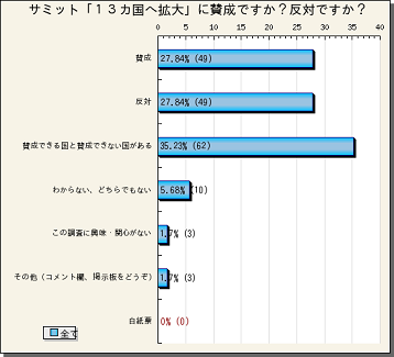 『サミット「13カ国へ拡大」に賛成ですか?反対ですか?』の途中結果をお知らせします。
