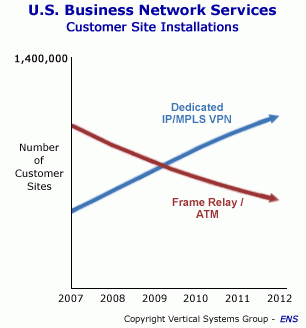 米国マサチューセッツ州に本社を置くVertical Systems Groupが提供する年間情報サービス「ENS Research Program」の最新調査によれば、米国の専用IP/MPLS VPNサービスの顧客サイト数が今後18ヶ月でフレームリレー/ATMネットワークサービスの導入基盤を超え、さらに2011年には100万サイトに到達すると予測されています。IPトラフィックの急激な増加とそれに伴って発生する帯域要件から、レガシーサービスからマネージドVPNへの企業ネットワークの移行が加速度を増しています。