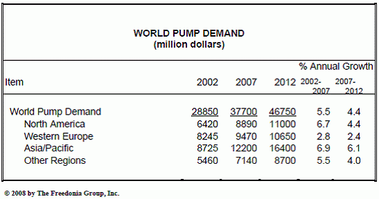 世界市場における流体処理ポンプの需要は、今後年率4.4%で拡大し、2012年には470億ドルに達する見通しです。世界のポンプ需要は、総体的に見て底堅い景気に後押しされる形で伸びていくと見られ、とりわけ中国やインドなどの成長著しい新興国で着実な伸びが期待できます。新興国では、エネルギー消費の拡大とインフラストラクチャの開発プロジェクトが続いており、ポンプの主な用途もこれらの分野が中心になると思われます。各種産業分野の戦略的分析を専門に行っている米国の調査会社The Freedonia Groupがこのほど発行した調査報告書「World Pumps」には、世界のポンプ市場におけるさまざまなトレンドが紹介されています。