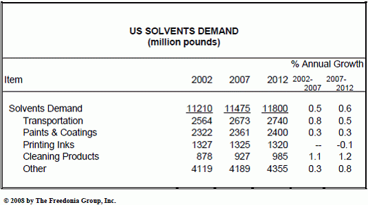 米国市場における化学溶剤の需要の伸び率は、年1%を下回ると見られており、2012年の時点で118億ポンド(およそ535万トン)になる見通しです。コーティングメーカーや印刷用インクメーカー、接着剤メーカーは、製品に含まれる揮発性有機化合物(VOC)の量を減らすためさまざまな対策を講じており、化学溶剤に対する需要の伸び率は、今後も米国の経済成長率を下回り続けると思われます。しかし、特殊溶剤や環境負荷の少ない「グリーン溶剤」、毒性プロファイルや大気汚染プロファイルが良好な既存の溶剤などの分野では、今後も一定の成長が見込めます。
