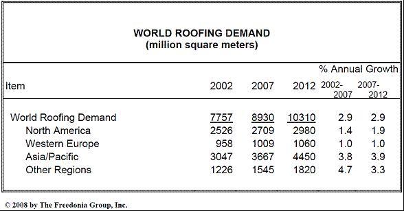 中国を含むアジアの新たな経済圏は、2012年までの屋根材需要において、もっとも急速な成長を記録すると予測されています。インド、フィリピン、マレーシアなどの急速な人口増加が住宅需要を生み出し、中国、インド、マレーシアの力強い経済成長が非住宅市場の需要を刺激するでしょう。中国市場は米国を抜き、地域別で世界最大の屋根材市場になると予測されています。低勾配の屋根材(改質瀝青(ビチューメン)・エラストマ/プラスチックメンブレンなど)の需要は、非住宅市場の強力な需要から恩恵を受け、平均以上の利益をもたらしてくれるでしょう。