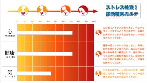 [ストレス検査!リスクチェック]は、精神看護学者が心・気・健康の3つの面から貴方のストレスを調べてくれる。結果はそれぞれ、ココロに関してのストレス、気力が減少してのストレス、健康不安によるストレスが、パーセンテイジグラフで現れ視覚的にも分かりやすい。そして、貴方自身に役立つメッセージ、解消する音楽療法CDを奨めている。