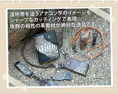 パイソンと抜群に相性の良いポニーダコタ調ヌメ革とのコンビネーションを、湿地帯を這うアナコンダのイメージをシャープなカッティングとで表現しました。