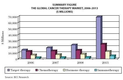 癌の治療法として、化学療法、ホルモン療法、標的治療および免疫療法の4つのタイプがあり、これらのうち、市場シェアが最大となるのは、標的治療セグメントで、2008年に229億ドル、さらに2013年には691億ドルに達すると見込まれています。2007年の全体市場では、標的治療が約45%を占め、そのシェアは2008年末には48%、さらに2013年には62.5%に拡大すると見込まれています。