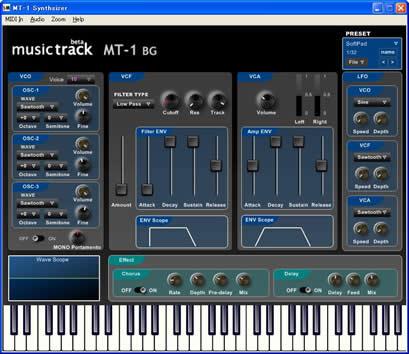 無償で提供するソフトウェアシンセサイザー【MT-1】は、シンセサイザーの初心者でもその仕組みや音作りを感覚的に学びながら操作できるように考えて制作されたソフトウェアによるバーチャルアナログシンセサイザーです。 ミュージックトラック( http://musictrack.jp )にユーザ登録することでダウンロード可能になり、Windows PC上で特別な機器や環境を必要とせずにスタンドアロンとして動作するフリーウエアです。