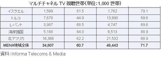 Informa Telecoms & Mediaが発行した最新の調査報告書「Middle East and Africa TV」では、中東および北アフリカ(MENA)地域におけるTV視聴世帯の61%がマルチチャネルTVサービスを利用しているという事実が明らかになっています。同報告書によると、マルチチャネルサービスを利用する世帯は、2013年までにさらに1,400万世帯増え、普及率も72%近くになる見通しです。マルチチャネルサービス利用世帯の拡大は、この地域におけるTV広告収入の大幅な増加を促すと見られており、2007年に19億ドルだった売上高は2013年の時点で33億ドルに達すると予想されています(この間の成長率は73%)。