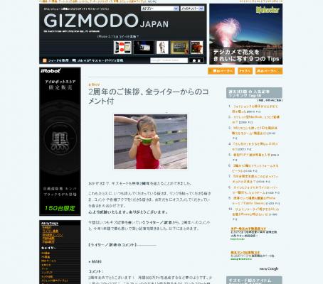 ターゲット・メディア・カンパニー、株式会社メディアジーン(本社:東京都渋谷区、代表取締役:今田素子、以下メディアジーン)が運営する『ギズモード・ジャパン』( http://www.gizmodo.jp/ )は、2008年7月31日(木)にサービス開始2周年を向かえ、3年目に突入いたしました。