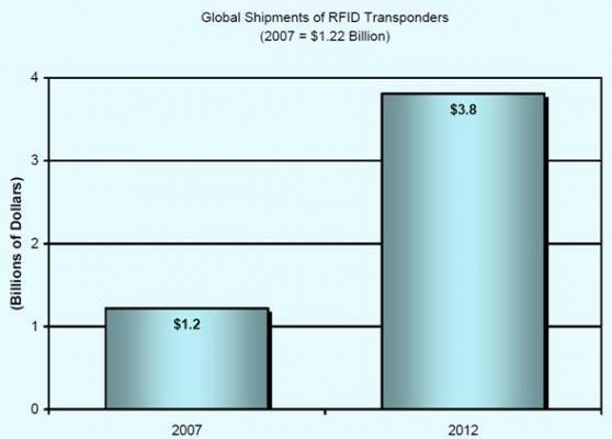 世界のRFIDトランスポンダ市場は2007年に12億米ドルを超えました。今後2012年までにCAGR25%超で成長すると見込まれています。また2007年の出荷台数は16億台を超えましたが、これは2012年までに60億台を超えると予測されています。