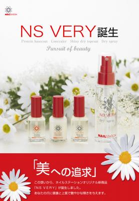 「美への追求」をテーマとして、「NS VERY」が誕生しました。4種のネイル商品は、爪に健康とつややかな輝きを与えます。「ベースコート」は、爪本来の成長を考え、バンブーエキスを配合し爪のたんぱく質を強化します。「コンシーラー」は、凸凹のある表面を滑らかにしカラーの定着・発色をよくします。「ドライトップコート」は、速乾性に優れつやが長持ちするトップコート。カラーの美しさを保ちます。「ドライスプレー」は、ネイルカラー用速乾スプレー。トップコートの後に使用することで、速乾性があり光沢を与えます。