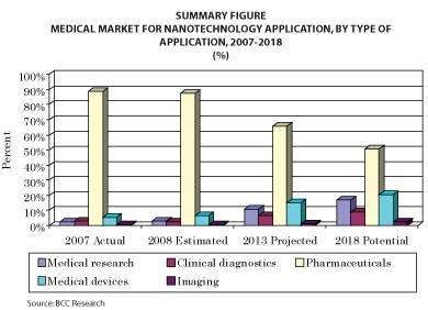 米国の調査会社BCC Research,が発行した報告書「GLOBAL MEDICAL MARKETS FOR NANOSCALE MATERIALS AND DEVICES」によると、世界におけるナノテクノロジー・アプリケーション向けの医療市場は2007年に17億米ドルを記録しました。さらに、2008年には19億米ドル、その後、CAGR19.9%で拡大し、2013年には38億米ドル規模となる見込みです。