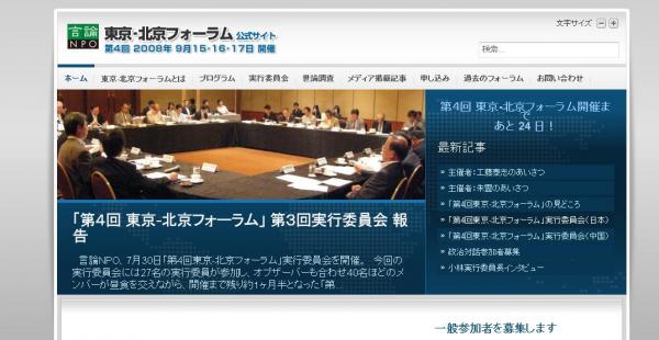 本フォーラムは、2005年夏、反日デモ直後の北京で、非営利組織である言論NPO、中国4大メディアの一つチャイナデイリー及び北京大学が共同で立ち上げました。フォーラムは、日中間で毎年行われる共同世論調査を軸に、両国民の意識を取り入れ、日中間の課題に正面から向き合い、本音で対話する議論の舞台を民間で作り出すことを目的にしています。中国ではこれを「公共外交」の舞台とし、国務院新聞弁公室や対外友好協会が全面的にバックアップしております。これは民間対話の舞台としての役割だけでなく、政府関係者なども加わり、共通の課題解決のために討議する場という意味でもあり、トラック1.5と位置付けられています。参加者は両国の有識者、政治家、メディア関係者など各界を代表するオピニオンリーダーです。東京と北京で毎年交互に開催されており、2015年まで継続して行うことが合意されています。これまでに3回にわたって開催されています。