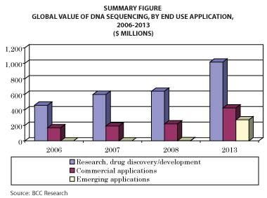米国の調査会社BCC Researchが発行した報告書「DNA SEQUENCING: EMERGING TECHNOLOGIES AND APPLICATIONS」によると、2007年におけるDNAシーケンシング技術の世界市場は7億9400万米ドルを記録しており、2008年には8億6250万米ドルに到達する見込みで、その後、年率平均14.7%で成長し、2013年には17億米ドル市場となることが予測されます。