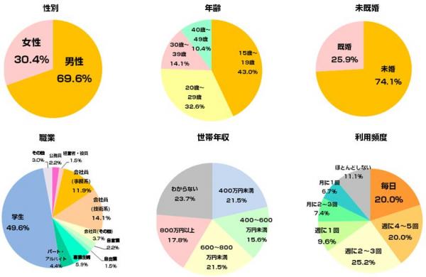 モンスターハンターを利用している属性として、男性が69.4%、15歳から19歳が43.0%であった。学生の利用が49.6%と約半数であるものの、半数が学生以外、利用者の約30%が女性と幅広い利用が見受けられる。利用頻度については毎日が20%であった。