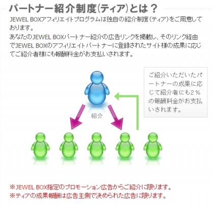 「JEWEL BOX」とはブログやホームページなどのサイトを運営するパートナーが、クライアントの希望する広告を掲載し、それを通じてインターネットユーザーをクライアントサイトに誘導することで報酬を得るアフィリエイトサービスです。「JEWEL BOX」は、女性向け商材・サービスに特化し、また独自のパートナー紹介制度(ティア)機能を搭載しております。