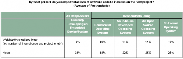 VDCは、システムの複雑化とコードベース全体の規模との間にある相関関係を指摘したうえで、市販のOSやオープンソースのOSを利用したプロジェクトが、今後増加すると見られている組み込みソフトウェアコードベースの大半を占めるとの見通しを示しています。またVDCの調査からは、市販のOSやオープンソースOS、自社開発のOSを使ったプロジェクトはもちろん、正式なOS(対象となるシステムで稼動する)を使わないようなプロジェクトに従事している技術者たちも、今後、組み込みシステムを設計する際にはこれまでよりもはるかに多いソフトウェアコードを使うようになると考えていることが明らかになっています。同報告書のデータによると、1回のプロジェクトで使用されるコードの行数の伸び率は昨年よりも小さくなる見通しです。しかし組み込みシステムの技術者たちは、今後行われるプロジェクトで使用されるソフトウェアコードの行数について、平均で20%以上の増加を見込んでいます。