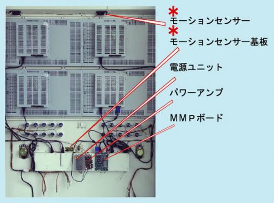 画期的なサウンドコントローラーであるモーションセンサーシステムは、MMPボードによってディスプレイされるデモ画面、プロモーション映像のサウンドを自動制御します。ライブモニターマルチDXの周辺にお客様がいないときは、サウンドを消し、お客様が近づいたらサウンドが出力されます。お客様が離れると再びサウンドは消えます。