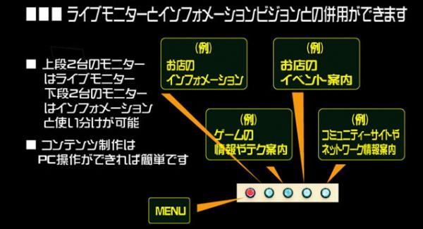 コンテンツメニューは、4つ設定することができ、筐体中段に位置するボタンから選択して再生することができます。具体例としては、お店のインフォメーション、お店のイベント案内、ゲームの情報やテクニック案内、コミュニティサイトやインターネット情報案内などが挙げられます。また、画像や動画などのコンテンツはカードメディアの容量に応じて、数十、数百設置することが可能です。