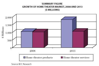 2008年現在、ホームシアター製品セグメントの市場シェアは、全体市場の約50.6%を占めており、2013年には63.2%に拡大すると見込まれます。2006年における当セグメントの収益は9億6,220万ドルで、2008年にはおよそ11億ドルとなることが期待されます。同市場は、その後もCAGR11.7%で拡大し、2013年には18億ドル規模になると予測されます。
