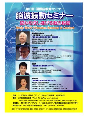 誰でも簡単に楽しく行なえる画期的な健康トレーニング『脳波振動』を音楽や講和などを通して、大阪国際会議場にて11月9日11時より行ないます。講演者は、「脳波振動」トレーニングの創始者・国連諮問機関NGOの脳科学研究院院長、国際脳教育総合大学院大学総長である一指 李承憲博士、また科学的な「脳波振動」の研究をしている東邦大学医学部の有田秀穂教授、心理学的な面からは、大阪経済大学の小宮昇准教授がそれぞれ研究の成果を発表いたします。また、「脳波振動と音楽~希望を求めて~」と題し、大阪音楽大学講師の野間直子氏がコンサートを行ないます。「脳波振動トレーニングに際し、健康・幸せ・平和をコンセプトに深い体験ができるイベントです。
