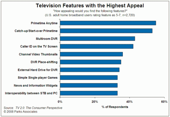 Parks Associatesが発行した市場調査報告書「TV 2.0: The Industry Perspective」では、ゴールデンタイムのプログラミングは、サービスプロバイダーの収益を増加させ、チャーンを減少させる見込みがある高度なテレビ機能の土台となっていると報告しています。同書は、米国におけるブロードバンド世帯の50%以上がオンデマンドのゴールデンタイムサービスに魅力を感じており、VODライブラリー、マルチルームDVR、PC-TV接続および情報ウィジェットなどのサービスを高度テレビ機能リストのトップに置いていると指摘しています。