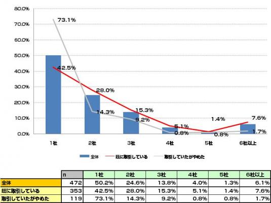 2社以上の取引は、現在の利用者で57.5%、取引をやめた人で26.9%であり、3社以上の取引では、現在の利用者で29.5%、取引をやめた人で12.6%であった。また、現在の利用者は6社以上の取引でも7.6%であった。