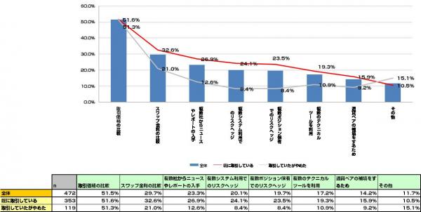 複数社取引している理由としては「取引価格の比較」が51.5%と最も高く、「スワップ金利の比較」で29.7%、「ニュース・レポートの入手」が23.3%と続く。また、現在の利用者と取引をやめた人では「取引価格の比較」以外で意識の差がうかがえる。
