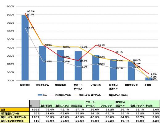オンラインFX会社を選ぶ際に重要視することは「取引手数料」が79.4%でトップだが、利用状況によっては重要視する項目の違いがうかがえる。