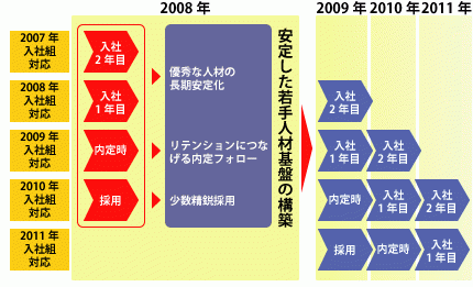 しかし、その増加率は年々減少傾向にあり、2010年は昨今の景気悪化に伴い、ついに前年を下回る見通しが高くなっています。一方で、入社3年目までの若年層の離職率は相変わらず高い状況です。