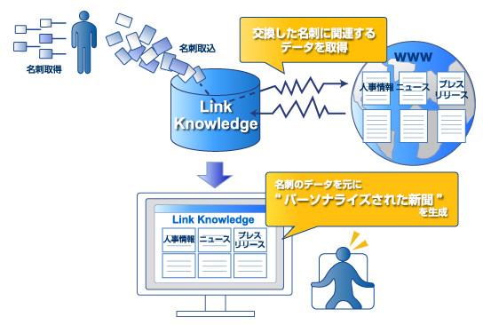 サービス2年目においては、CRM機能の強化に加えて、「Link Knowledge '09 - Smart Recommendation」というテーマを設定しライフログ(活動記録)としての名刺から、ビジネス情報のレコメンデーション(ユーザごとの特性に あった情報提供)を実現していきます。一言で言えば、名刺からパーソナライズされた"新聞"を生成するイメージです。名刺は面会の記録であり、その相手と 繋がりが生じたことを意味します。 名刺をスキャンするだけで、その名刺に関連する人事異動情報、ニュース、プレスリリースなどの情報を収集・整理して提供します。尚、本件についてはビジネスモデル特許を出願中です。