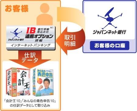 「IB連携オプション」は、ソリマチの会計ソフト「会計王10」及び「みんなの青色申告10」に同梱されるプログラムで、ジャパンネット銀行口座(※1)の取引明細を専用の仕訳データとして取り込むことができるシステムです。これにより「会計王10」「みんなの青色申告10」のユーザーは、銀行口座の取引明細を正しくソフト側に反映させ、手作業による入力のミスや漏れを防ぐと同時に、仕訳入力作業を軽減することができます。