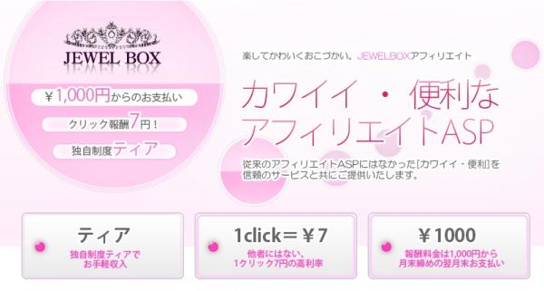 「JEWEL BOX」はジュエルボックス株式会社が2008年9月30日から正式運営を開始した女性向け商品・サービスに特化したアフィリエイトサービスです。広告は女性向けのかわいい、おしゃれな商材・サービスを中心に展開し、初心者の方でも使いやすい管理画面、独自のパートナー紹介制度(ティア)機能を搭載しております。