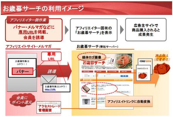 アクセストレードでは、大手百貨店・ショッピングモールなどの、お歳暮ギフト商品を多数取り扱うマーチャントへの新たな販売チャネル提供と、アフィリエイターの商機拡大を目指し、「お歳暮サーチ」を立ち上げました。