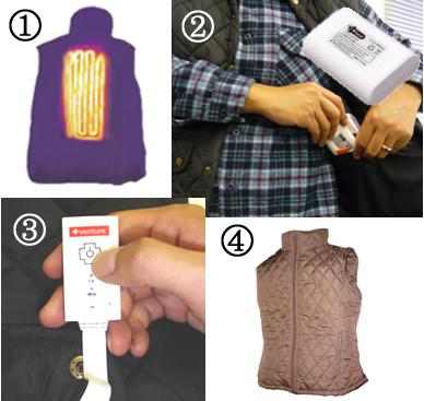 アメリカのヒート衣料開発メーカーであるベンチャーブランドと共同で開発。カーボンファイバーヒーター内蔵で小型のリチャージブルリチウムバッテリーを内ポケットに収納し、約3~5時間連続使用が可能。ヒーテック部分は背中の肩甲骨中央から腰にかけて約30センチもの大判を使用。約10秒で瞬時に温まり5分間で遠赤外線効果により全体的に温まります。