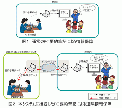 地域によっては人材の確保や、高度なスキルを持ったパソコン要約筆記者の確保には現在のところ困難を伴うことが少なくありません。 今回開発された遠隔支援システムは、この問題を解決するために、インターネットが活用されています。インターネットを通して、教室の音声や映像を遠隔地にいる要約筆記者のもとに配信し、そこで字幕化されたデータを再びインターネットを通して、教室のパソコンに戻す仕組みになっています(図2参照)。