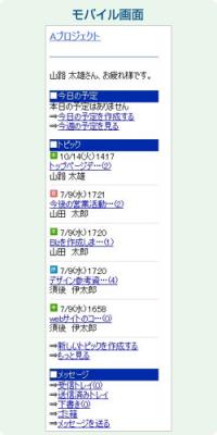携帯電話では、「カレンダー」での予定の確認・登録、「トピックス」への書き込み・確認、「メッセージ」での送受信・確認など、プロジェクトの進捗を確認するために必要な機能はパソコン同様に利用できます。(※1)また、携帯電話ならではの「アクセスキー」にも対応しており、ボタン操作ひとつで目的の機能を素早く利用することができるようになりました。