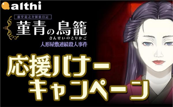 『菫青の鳥籠』のパソコン用公式ウェブサイト( http://www.althi.co.jp/mystery/toudou/kinsei/ )にございますキャンペーン専用応援バナーとリンク用URLを、キャンペーン参加者が運営するウェブサイトまたはブログに掲載し、弊社サイトへのリンクを設置してください。