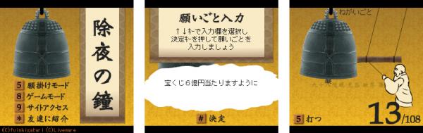 鐘を突いて108つの煩悩を滅却!!ふりこのように動く鐘をタイミングよく突く、操作性のシンプルなワンキーゲームです。まったりと遊べる「願掛けモード」、ゲーム性を重視した「ゲームモード」を搭載し、好みや気分によって遊び分けることができます。忙しい年末。お寺に行く暇のない人も、親指一本で気ままに年越し気分を味わうことができるコンテンツです!!春夏秋冬を表す背景変化に合わせ、1年の思い出を振り返ってみては!?