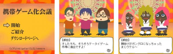 Yahoo!ケータイ⇒メニューリスト⇒ケータイゲーム⇒ゲームパック⇒フラッとオイデヨ三文堂⇒携帯ゲーム化会議