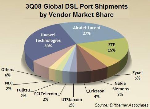 トップの2ベンダーは出荷台数において大幅な下落を見せ、上位3ベンダーのシェアは第3四半期に77%から72%へと減少しました。Alcatel-Lucentは四半期出荷台数においては首位の座にいるものの、第2四半期はHuaweiがAlcatel-Lucentから首位の座を奪いました。ZyXelは成長し、UTStarcom同様にアジア市場におけるプレゼンスを高めました。EricssonおよびNokia Siemensは従来の欧州市場における全体的な加入者数成長が鈍化したため減少しました。