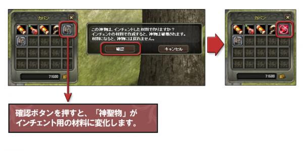 1.「神聖物」からインチェント材料を抽出します。「神聖物」は全てのキャラクターが最初から所持しており、こちらを右クリックして確認ボタンを押し、材料に変化させます。材料の抽出後、「神聖物」は消滅します。