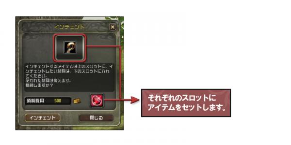 3.インチェント用スロットに、インチェント材料として、武器、防具などのアイテムをそれぞれセットします。