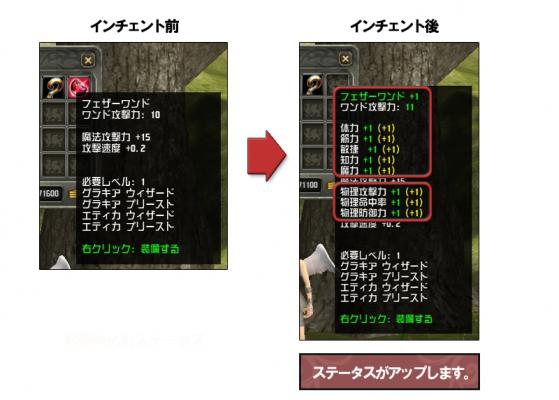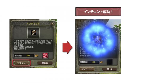 4.アイテムをセットした後、インチェントボタンをクリックすると、インチェントが実行されます。エフェクトが発生し、成功すると装備のステータスがプラスされます。インチェントは失敗する場合もありますが、その際は強化されていたステータスが下がり、エンチャントの材料は消失しますが、武器や防具などが無くなることはありません。