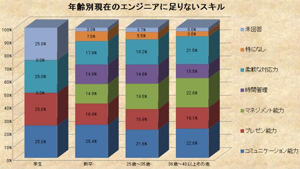 年齢別にみた、現在のエンジニアが思う足りないスキルは、年齢別にまったく異なっていることが解ります。その中でも一目瞭然なのが、マネジメント能力。それに反比例して減っているのが、時間管理能力となっています。これは、経験を積むごとに自己の時間を管理するという能力より、部下やプロジェクトを管理するためのマネジメント能力が必要とされていることが解ります。エンジニアとして、キャリアを続けるには、特に次の「コミュニケーション能力」「マネジメント能力」「柔軟な対応力」が必須であるという結果が出ています。