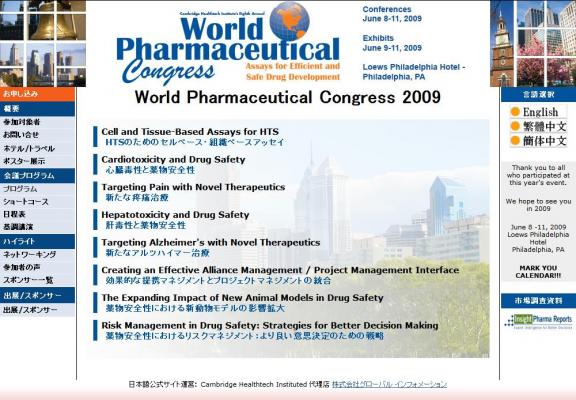 株式会社グローバル インフォメーションでは、皆様の利便性を図る為に、日本語、英語、韓国語、中国語、英語で「World Pharmaceutical Congress 2009」の情報を提供するとともに、会議の参加のお申し込みを承っております。