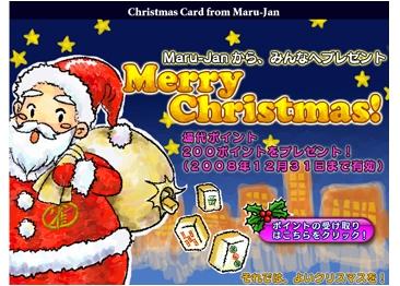 また、12月22日(月) 昼12時までに、「Maru-Jan」のメルマガに登録したユーザー(GyaOを通じて登録したユーザーも含む)に向け、クリスマスカードをメールにて配信する。このクリスマスカードや「Maru-Jan」サイトから特設ページへアクセスすると、漏れなく場代ポイント200ポイント(200円相当)がプレゼントされる。